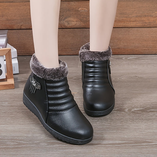 Women's Elegant Black Winter Snow Boots - Warm Fleece-Lined, Windproof Flat Ankle Boots with Non-Slip Rubber Sole, Decorative Bow Detail - Ideal for Outdoor Walks, Parties, and Camping, Soft Bottom, Snow Boots