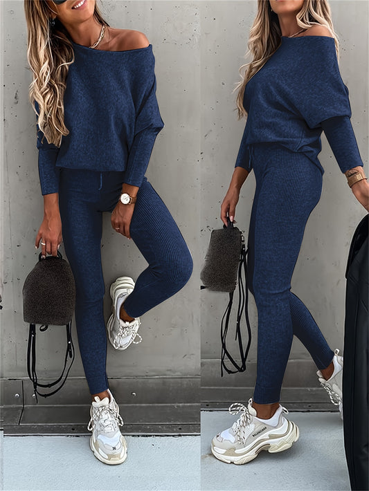 Women's Autumn and Winter Solid Color Off-Shoulder Sweater Top with Pants Set